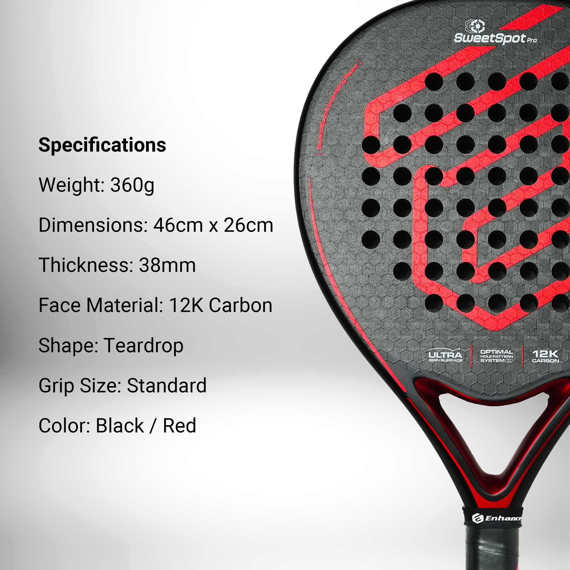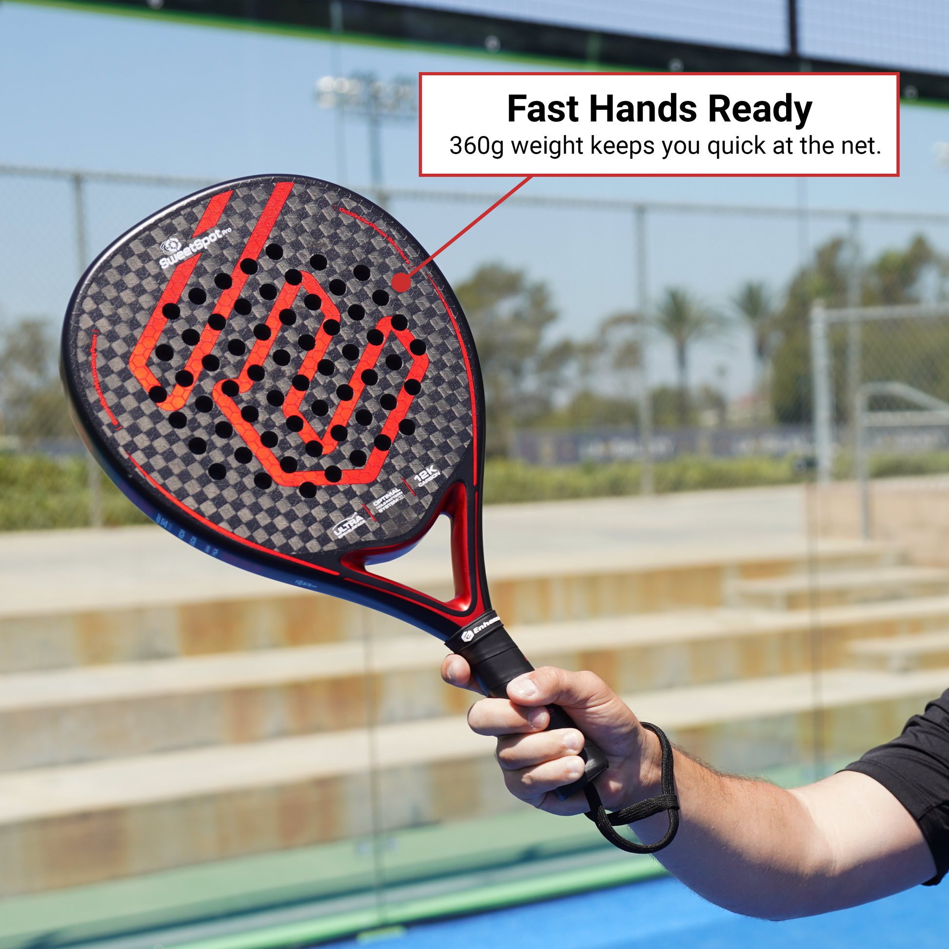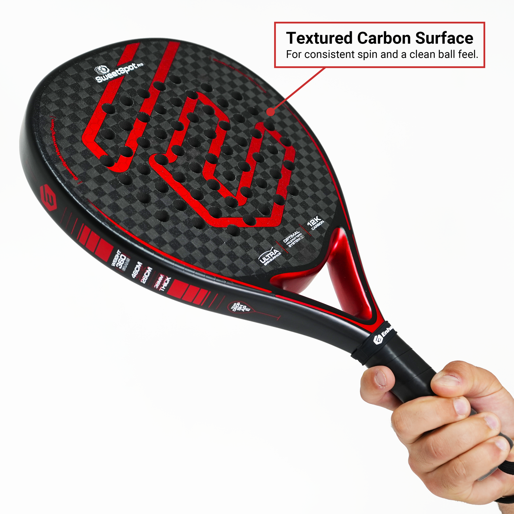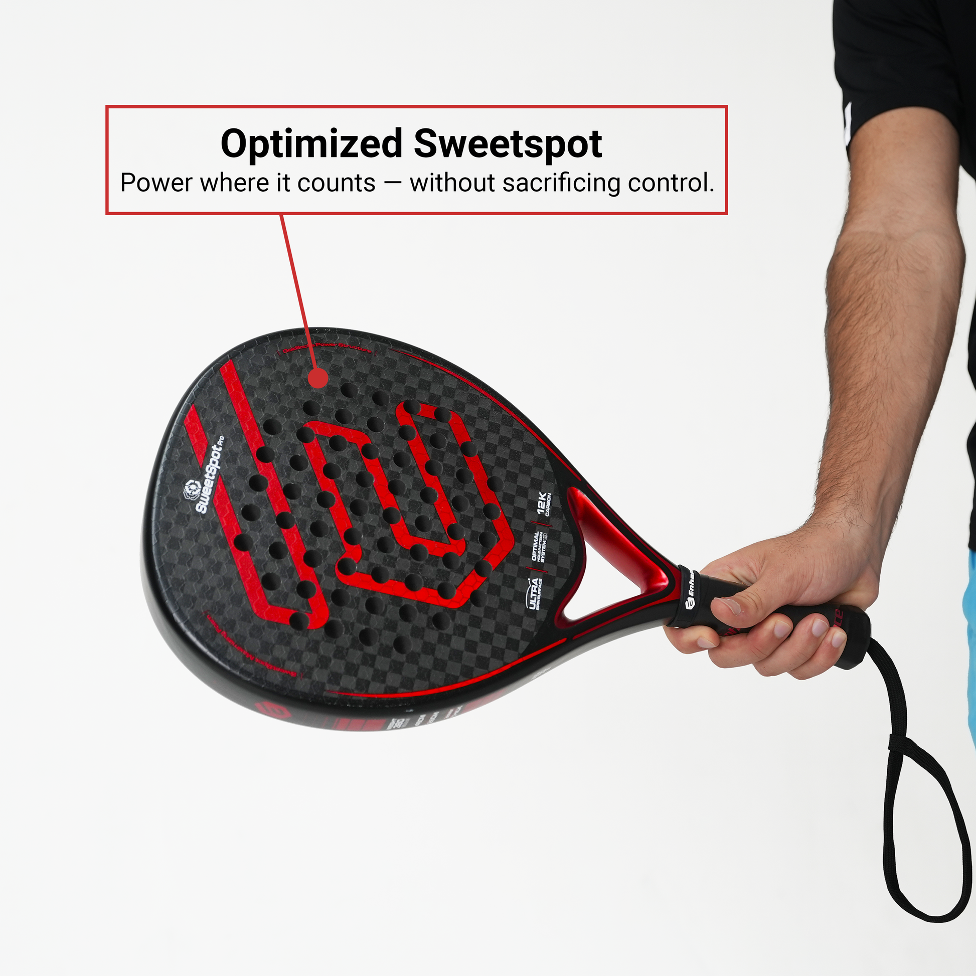 The SweetSpot Pro’s teardrop shape and 12K carbon face give you natural pop on every swing — without over-swinging. Whether you’re finishing a point or firing a deep lob, it delivers clean, easy power right when you need it.